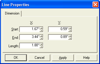 Use this dialog to change the characteristics of a Line object. Since Lines calculate their own length based on their Start- and End-point positions, you can either change the Start- and End-points or the Length value. A change in one field will prevent changes in other fields that are interdependent.