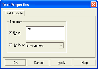 Attribute: the text object can take its value from the value of an attribute. You can select from attributes that belong to the text object directly (rare) or from those that belong to the symbol of which the text object is a part.