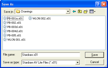 In addition to its native .S01 format, Stardraw A/V Lite can save files in .SDP (Stardraw Professional), FCD (FastCAD 2.72 and higher, ShuttleCAD 3.0), DXF and DWG (AutoCAD format) which are all vector formats, as well as BMP, GIF, JPEG, PNG and TIF which are raster, or bitmap, formats. Note that you can save to different versions of DWG and DXF file; since there can be significant differences between versions you should save to the version of AutoCAD that the recipient of the file is using, or to an earlier version.