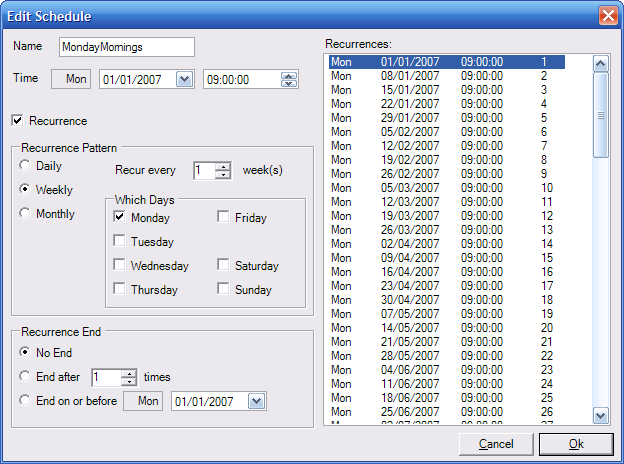 Specify a Recurrence Pattern of Weekly, with selected Days of Monday and click OK.