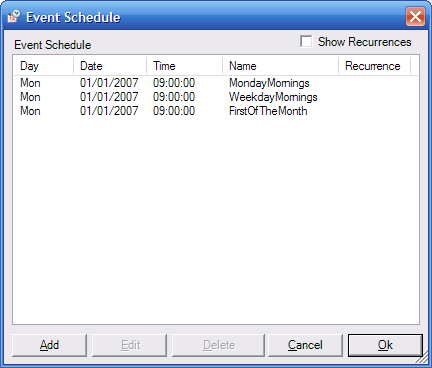 In the Property Grid is the EventSchedules collection property: click the ... button to open the Event Schedule dialog.