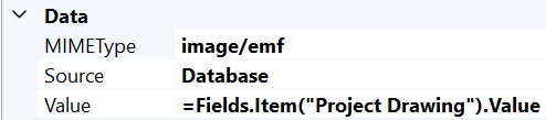 To use the Project Drawing image in a report, first insert an Image control and set its Data properties as shown here. To ensure that the Image retains the correct proportions, in the Layout group set Sizing to "FitProportional".